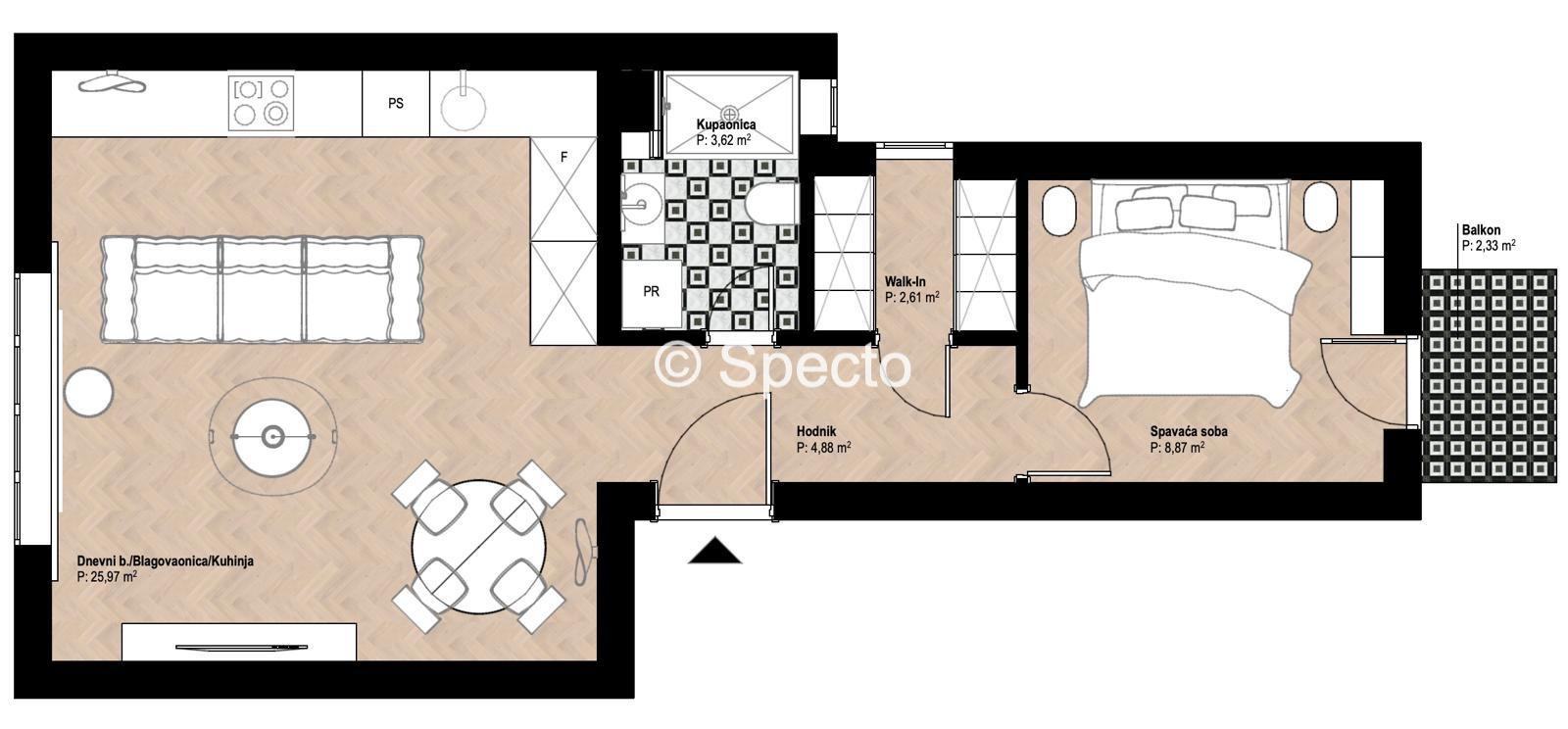 Sastoji se od: hodnika, spavaće sobe s izlaskom na balkon, walk in ormara, kupaonice s toaletom i dnevnog boravka s blagavaonicom i kuhinjom.